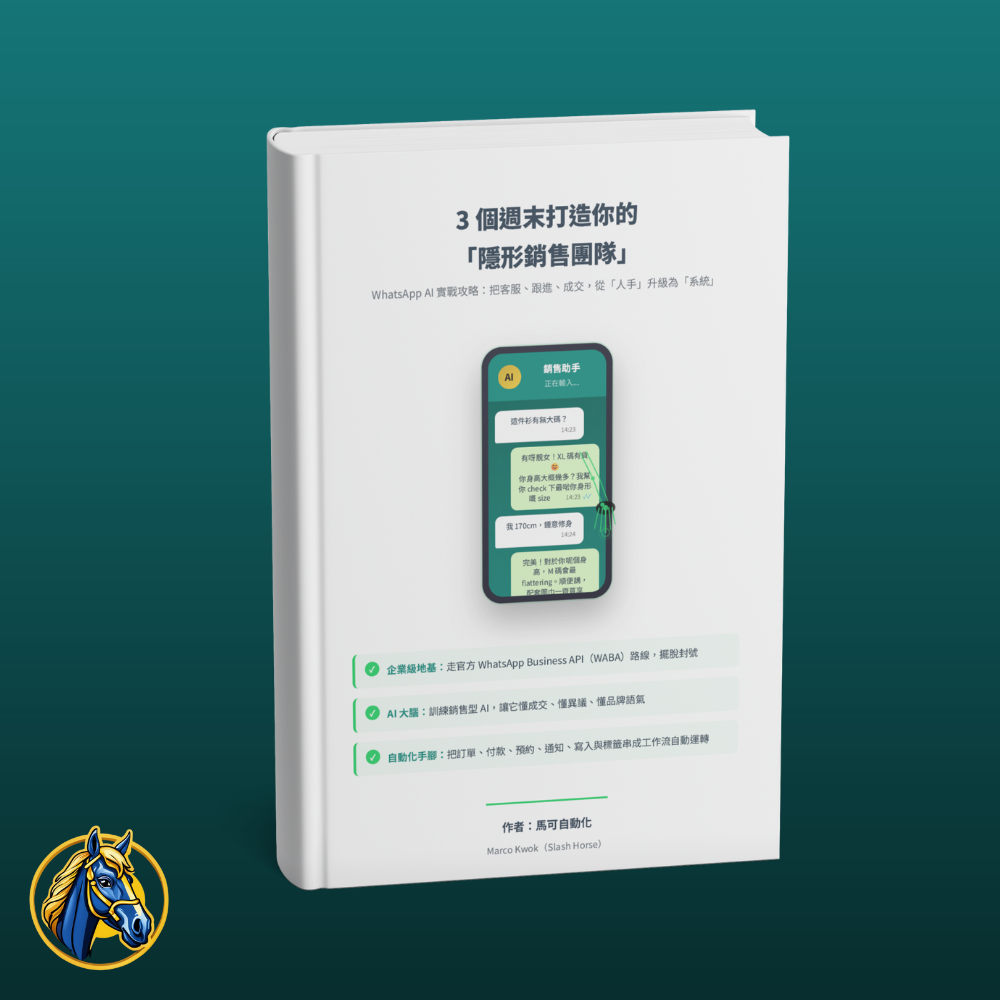 3個週末打造WhatsApp AI自動銷售系統。從API申請、AI銷售員訓練到全流程自動化,讓你的生意24/7自動接單。包含香港本地案例、行業劇本模板及技術陷阱解析。適合被WhatsApp綁架、想系統化營運的中小企老闆。